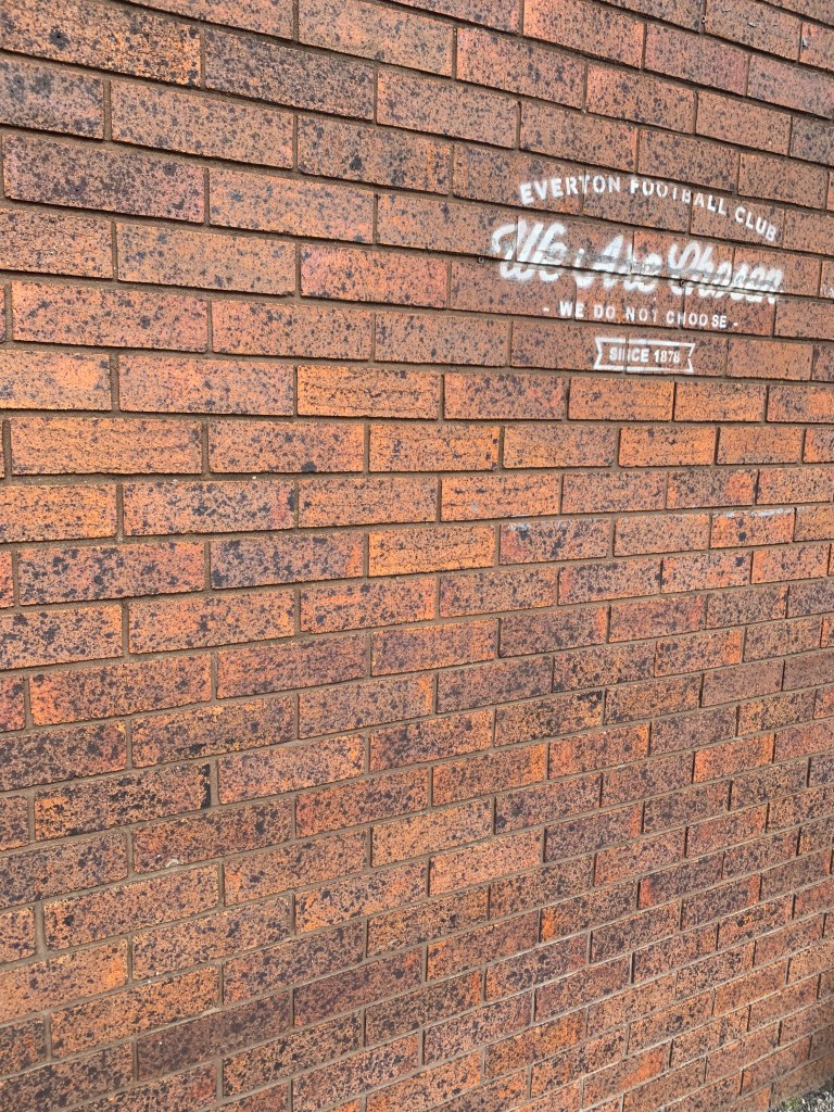 I told variations of the same story: I wanted to follow Premier League and knew I would never get up early to watch games without being all-in on a team, I couldn’t stomach picking a “big 6” team, I had heard of Everton because of Tim Howard, I knew they were a big enough club to never be in relegation danger (LOL), I read about all their work in the community, etc etc. But what I really wanted to say was what I had seen painted on a wall outside Goodison that afternoon: We are chosen. We do not choose. “It sounds stupid…” I kept prefacing, realizing that it might seem silly to people who were born and raised on Everton. On the surface I had chosen, I could have picked any club I wanted. But as I tried to say, perhaps not very eloquently after so many beers, is that I felt like I’d been born an Evertonian—I just didn’t know it for 30-some years. Everton had chosen me, not the other way around. It’s not stupid, was the response. It makes total sense. You’re an Evertonian, that’s all we need to know.